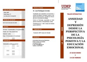 Hoy lunes, 13 de enero, se ha abierto el plazo de inscripción del taller interactivo “Ansiedad y depresión desde la perspectiva de la Psicología Positiva y la Educación Emocional”, que se celebrará los días 27 y 28 de enero y 3 y 4de febrero, en la sede de la Universidad Internacional Menéndez Pelayo (UIMP).