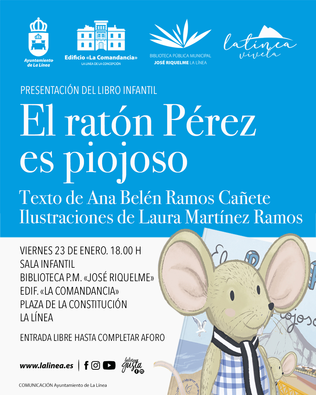 23 de Enero: 18:00 h.: Presentación del libro infantil El Ratón Pérez es Piojoso, de Ana Belén Ramos Cañete y Laura Martínez Ramos. Sala Infantil. Entrada libre hasta completar aforo.