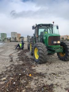 El dispositivo especial de la delegación de Playas aprovechó los periodos de tregua meteorológica para evitar la acumulación de restos vegetales y plásticos en la arena