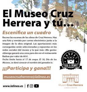 Para participar en ‘El Museo Cruz Herrera y tú’, se deberá enviar una fotografía de la recreación al correo electrónico: museocruzherrera@lalinea.es, adjuntando la imagen de la obra original que ha servido de inspiración. El plazo de recepción permanecerá abierto hasta el 17 de mayo. Posteriormente, una selección de las más destacadas se publicará en los perfiles oficiales en redes sociales del museo, donde la imagen que reciba mayor apoyo del público, (‘me gusta’), obtendrá una cena para dos personas en el restaurante Barbas. El fallo del certamen se comunicará el 18 de mayo, coincidiendo con el Día Internacional de los Museos.