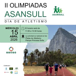 Mañana miércoles, 15 de abril, en horario de 11.00 a 13.30 horas, se celebrarán en las instalaciones deportivas municipales del parque Princesa Sofía las II Olimpiadas de Asansull “Día del Atletismo”, actividad que cuenta con la colaboración del Ayuntamiento de La Línea de la Concepción y el apoyo del voluntariado del colegio Los Pinos, Cruz Roja, Centro Contigo y Despierta.