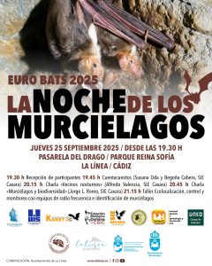 Diferentes actividades se han organizado mañana jueves, 25 de septiembre, con motivo de la “Noche de los Murciélagos”, prevista desde las 19.30 horas en la pasarela del Drago, en el parque Princesa Sofía, organizada por la Sociedad de Investigaciones Espeleológicas Caxara (SIE Caxara), en colaboración con la Estación Biológica de Doñana y la concejalía de Medio Ambiente y Transición Ecológica, dirigida por Raquel Ñeco.