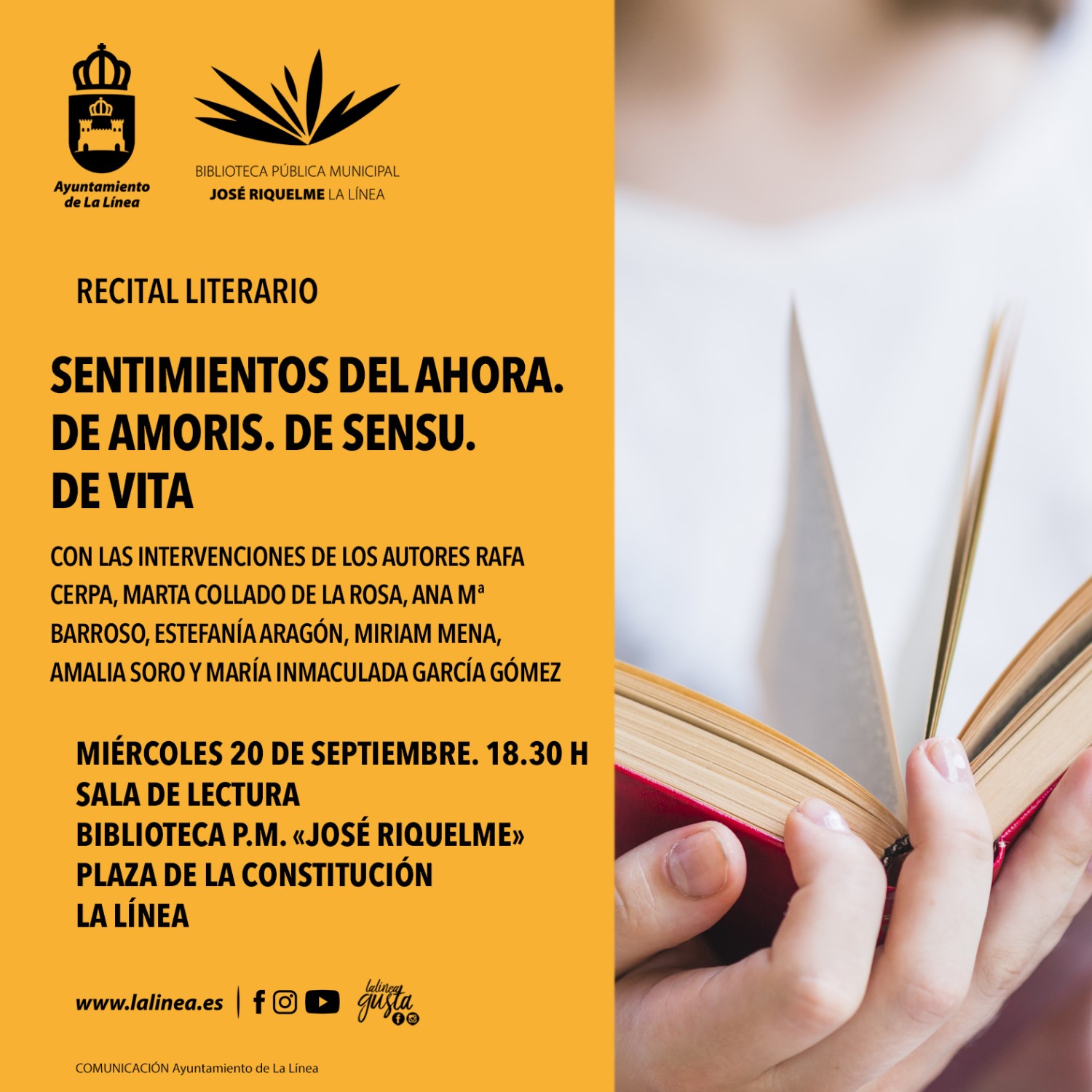La sala de lectura de la Biblioteca Municipal José Riquelme será escenario mañana miércoles, 20 de septiembre, a las 18.30 horas, del Recital Literario “Sentimientos del Ahora. De Amoris. De Sensu. De Vita”, que contará con las intervenciones de los autores Rafa Cerpa, Marta Collado de la Rosa, Ana María Barroso, Estefanía Aragón, Miriam Mena, Amalia Soro y María Inmaculada García Gómez.