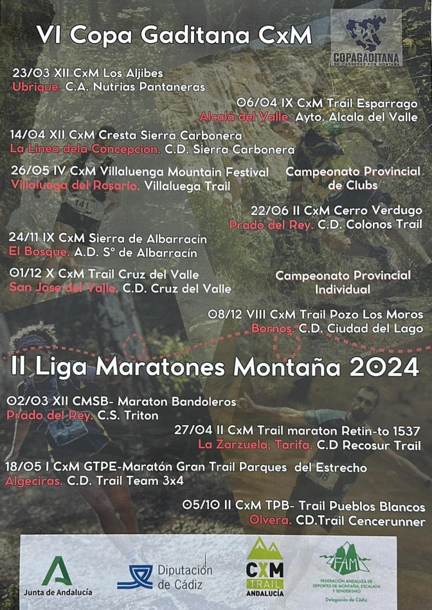 El 14 de abril se celebrará la XII Carrera por Montaña “Cresta Sierra Carbonera”, una de las ocho citas que comprenden el calendario de esta VI Copa Gaditana, que discurrirá por otros municipios de la provincia como los de Ubrique, Alcalá del Valle, Villaluenga del Rosario, Prado del Rey, El Bosque, San José del Valle o Bornos.