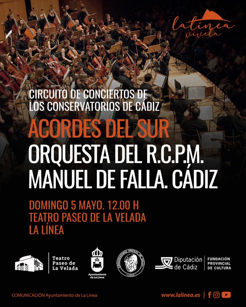 El domingo 5 de mayo a las 12:00h nuestro teatro ofrecerá un concierto gratuito de la Orquesta del Real Conservatorio Profesional de Música Manuel de Falla de Cádiz dentro del circuito de conciertos de los conservatorios de la provincia "Acordes del Sur"; promovido por la Diputación de Cádiz.